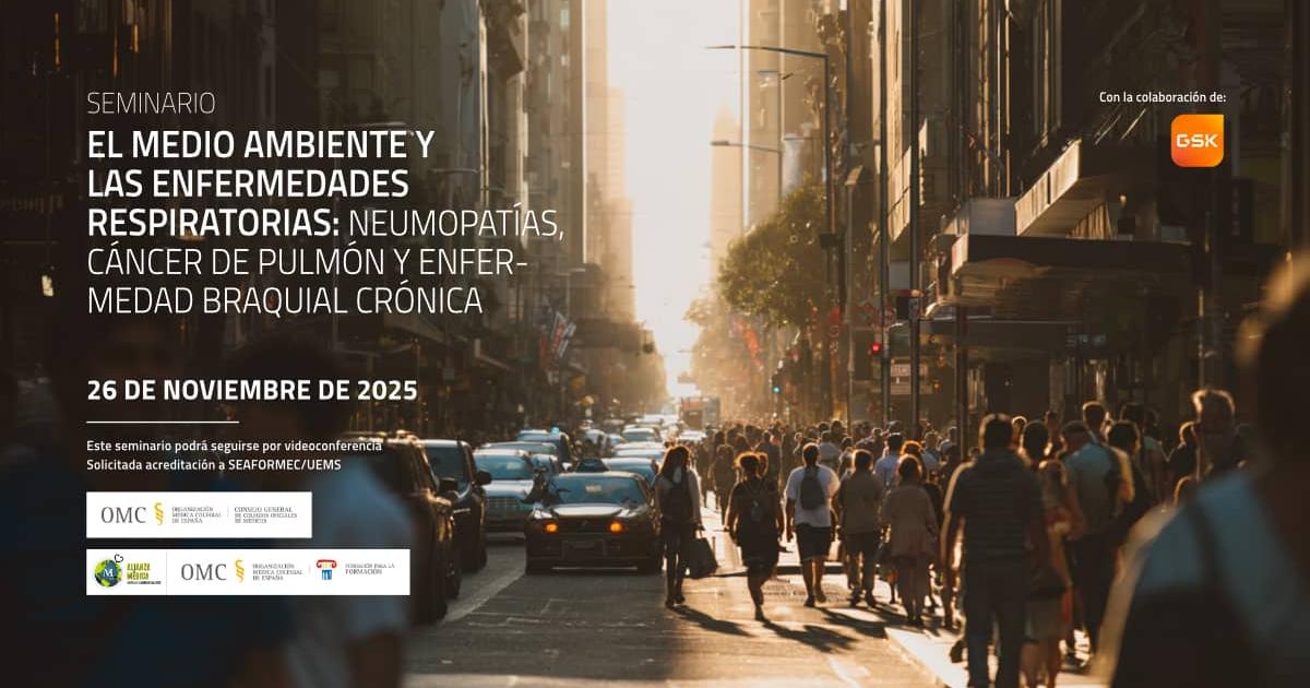 El próximo 26 de noviembre, a las 17.00 h., tendrá lugar el seminario El medio ambiente y las enfermedades respiratorias: neumopatías, cáncer de pulmón y enfermedad bronquial crónica, una cita dirigida a los profesionales sanitarios interesados en comprender la relación entre los factores ambientales y la salud pulmonar. La actividad se enmarca en las acciones de la Alianza Médica contra el Cambio Climático (AMCC).